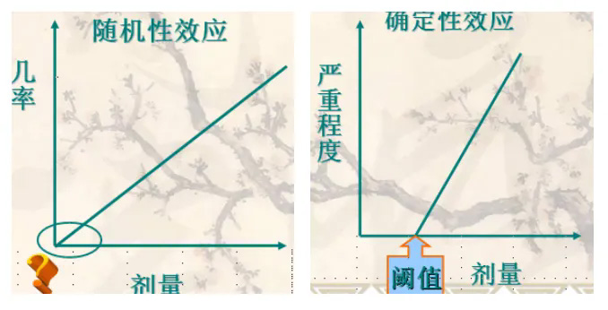 1.隨機性效應(yīng):無劑量閾值有害效應(yīng)的嚴(yán)重程度與受照劑量大小無關(guān),任何微小的劑量也可引起效應(yīng),只是發(fā)生的幾率極其微小而已。如:致癌效應(yīng)(癌癥 、白血?。?; 遺傳效應(yīng)(損傷發(fā)生在具有遺傳信息的功能細(xì)胞上,發(fā)生的效應(yīng)將顯現(xiàn)在受照者的后代身上)。