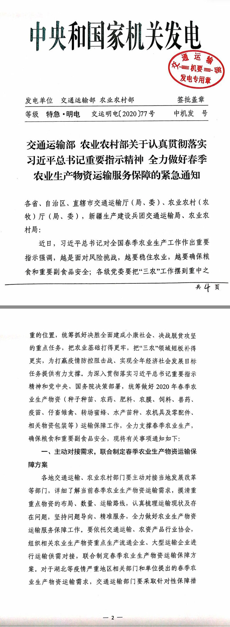 2月26日,交通運輸部、農(nóng)業(yè)農(nóng)村部聯(lián)合印發(fā)緊急通知,要求各地交通運輸、農(nóng)業(yè)農(nóng)村部門認真貫徹落實習近平總書記關(guān)于全國春季農(nóng)業(yè)生產(chǎn)工作的重要指示精神,按照黨中央、國務院決策部署,統(tǒng)籌做好2020年春季農(nóng)業(yè)生產(chǎn)物資(種子種苗、農(nóng)藥、肥料、農(nóng)膜、飼料、獸藥、疫苗、仔畜雛禽、轉(zhuǎn)場蜜蜂、水產(chǎn)苗種、農(nóng)機具及零配件、相關(guān)物資包裝等)運輸保障工作,全力支撐春季農(nóng)業(yè)生產(chǎn),確保糧食和重要副食品安全。