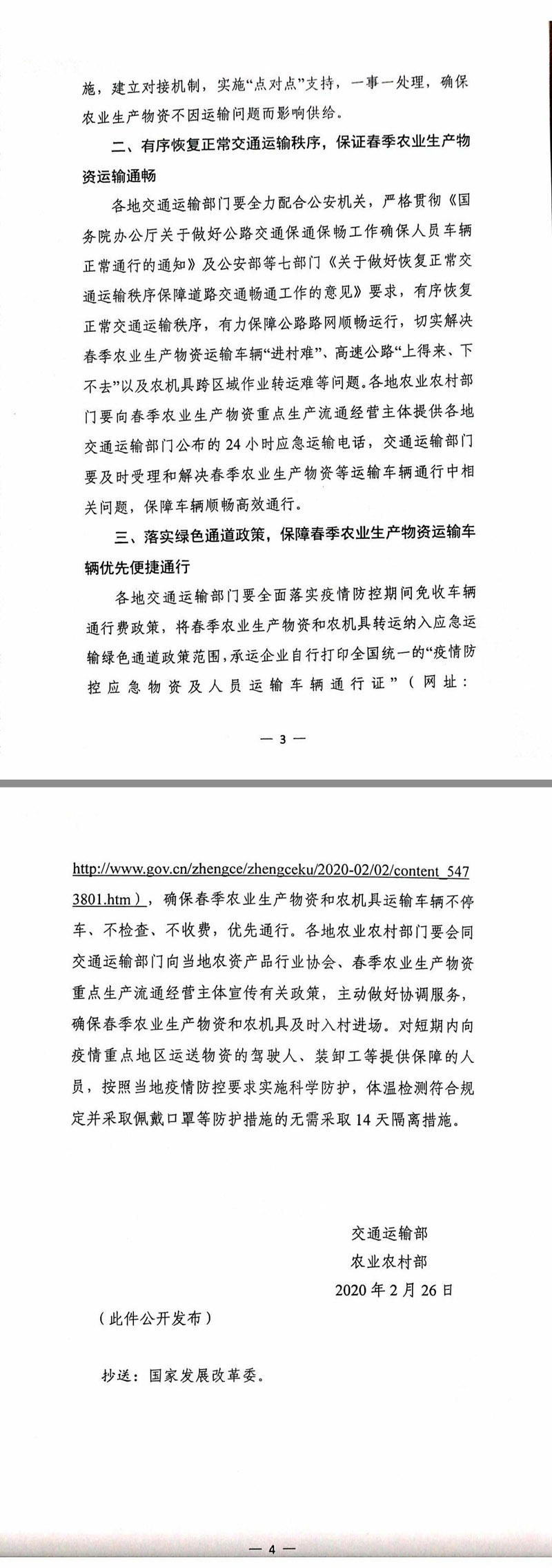 通知還要求,各地交通運輸部門要全面落實疫情防控期間免收車輛通行費政策,將春季農(nóng)業(yè)生產(chǎn)物資和農(nóng)機具轉(zhuǎn)運納入應急運輸綠色通道政策范圍,承運企業(yè)自行打印全國統(tǒng)一的“疫情防控應急物資及人員運輸車輛通行證”,確保物資和農(nóng)機具運輸車輛不停車、不檢查、不收費,優(yōu)先通行。