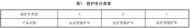 按產品功能和用途,將救護車分為3類,分類見表1。